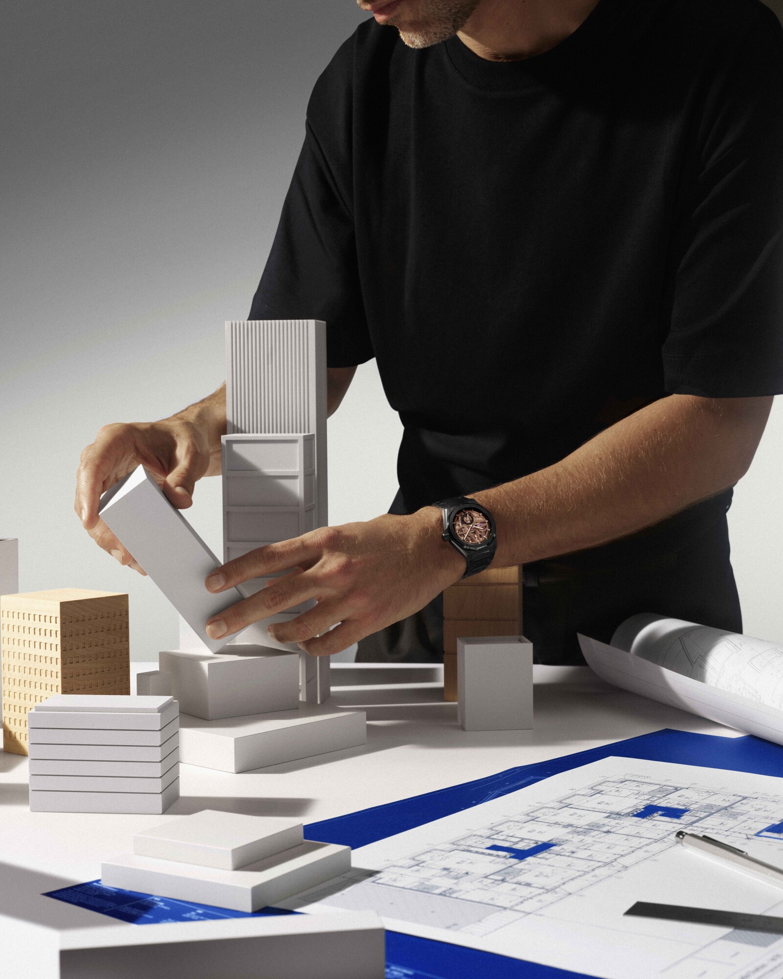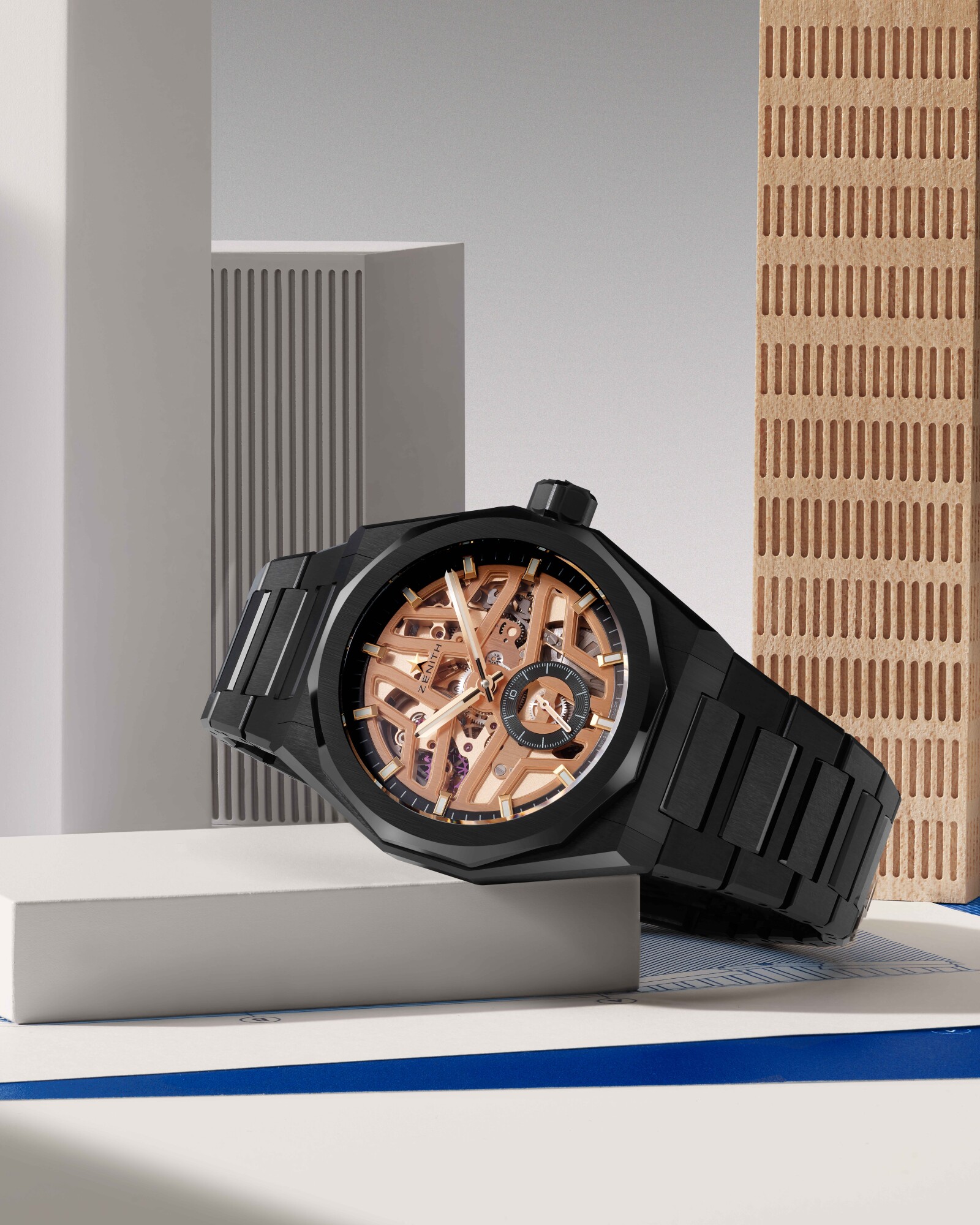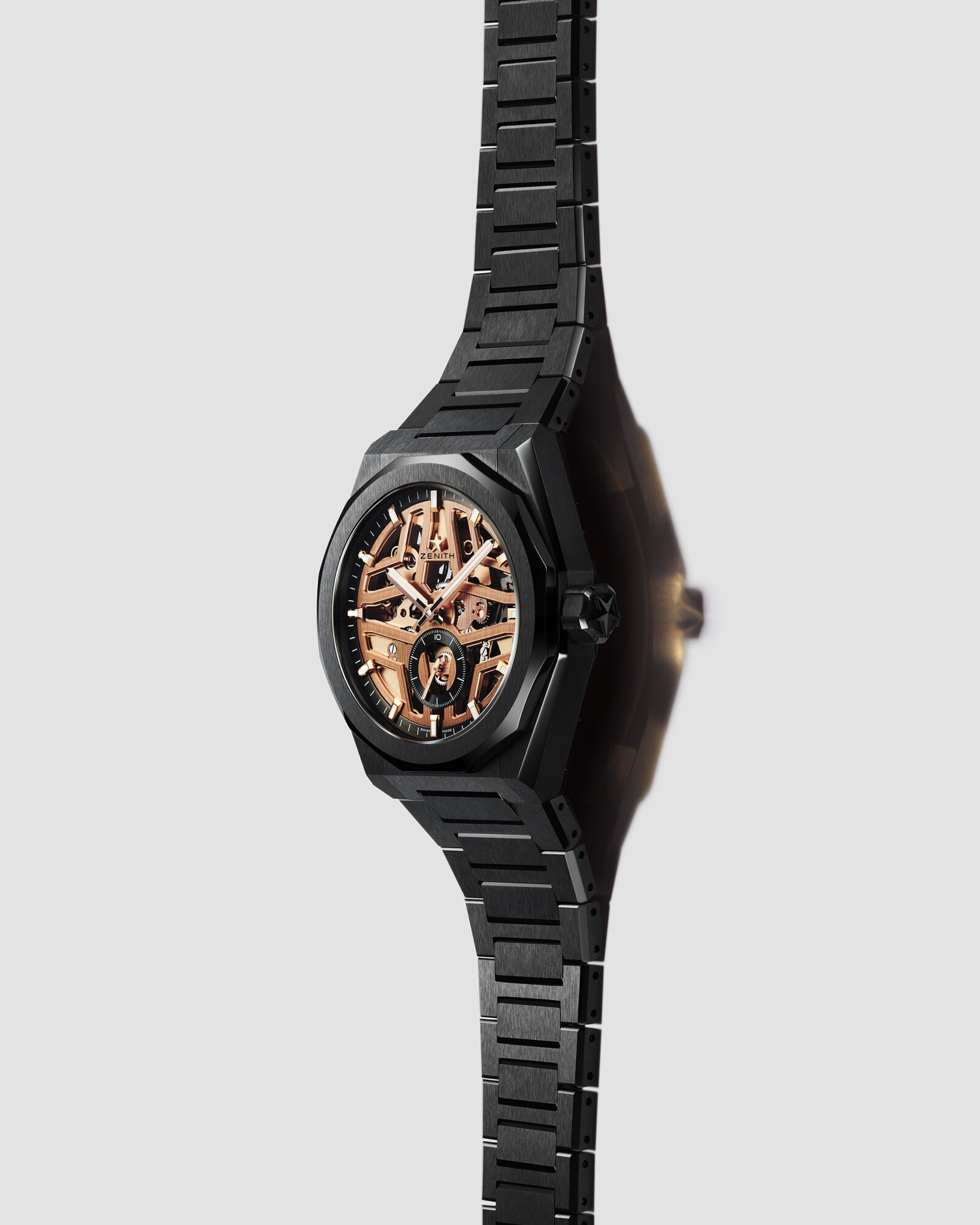 Dank ihrer markanten, durchbrochenen Architektur lässt die DEFY Skyline Skeleton kein technisches Detail des El Primero im Verborgenen – selbst die charakteristische 1/10-Sekunden-Anzeige kann in vollem Umfang bewundert werden. Die jüngste Ausgabe führt einen gänzlich neuen Kontrast ein und kombiniert tiefschwarze Keramik mit einem goldfarbenen Uhrwerk – eine Komposition, die an die blinkenden Lichter und huschenden Schatten einer modernen Stadtlandschaft erinnert.