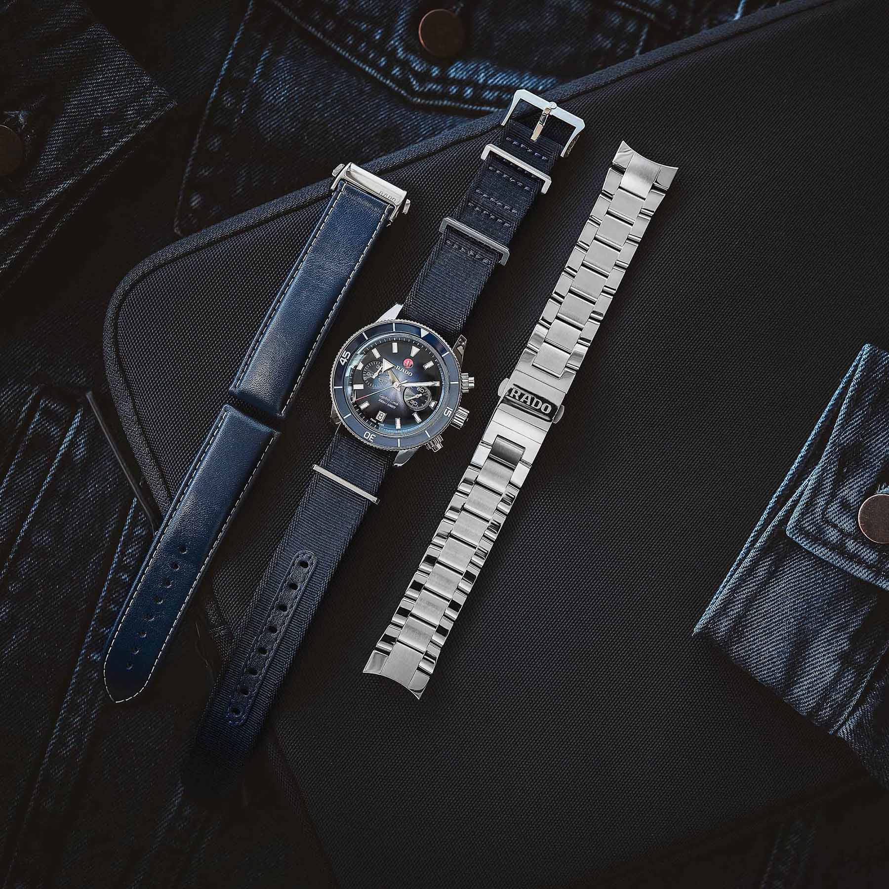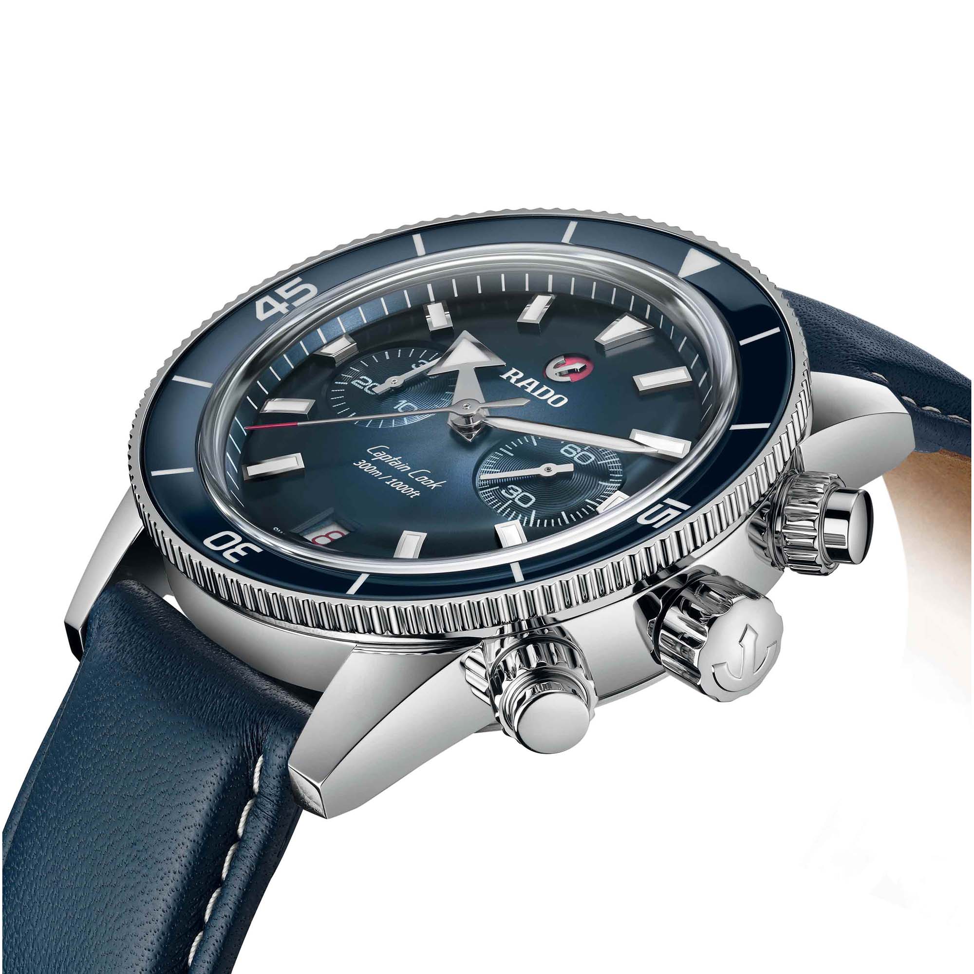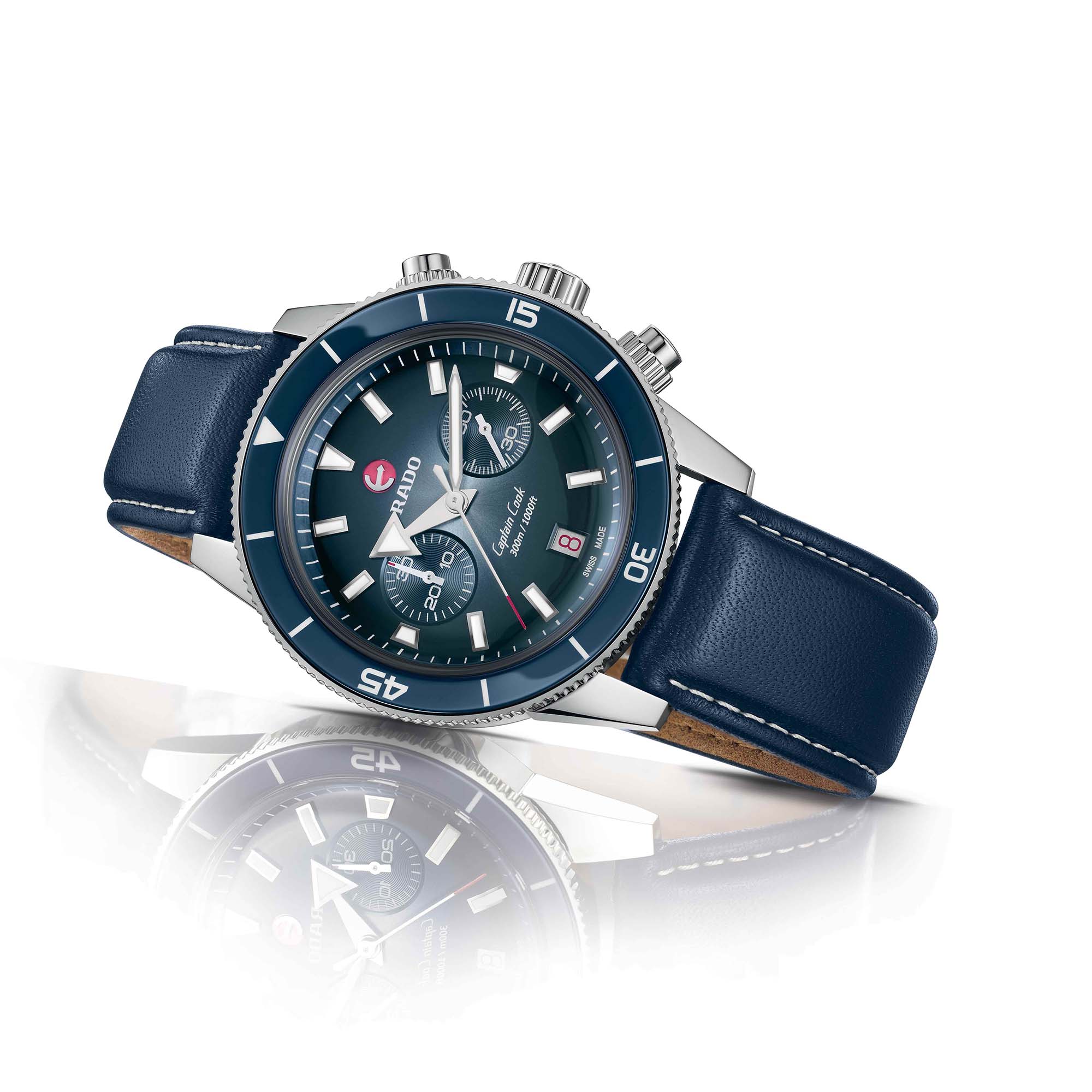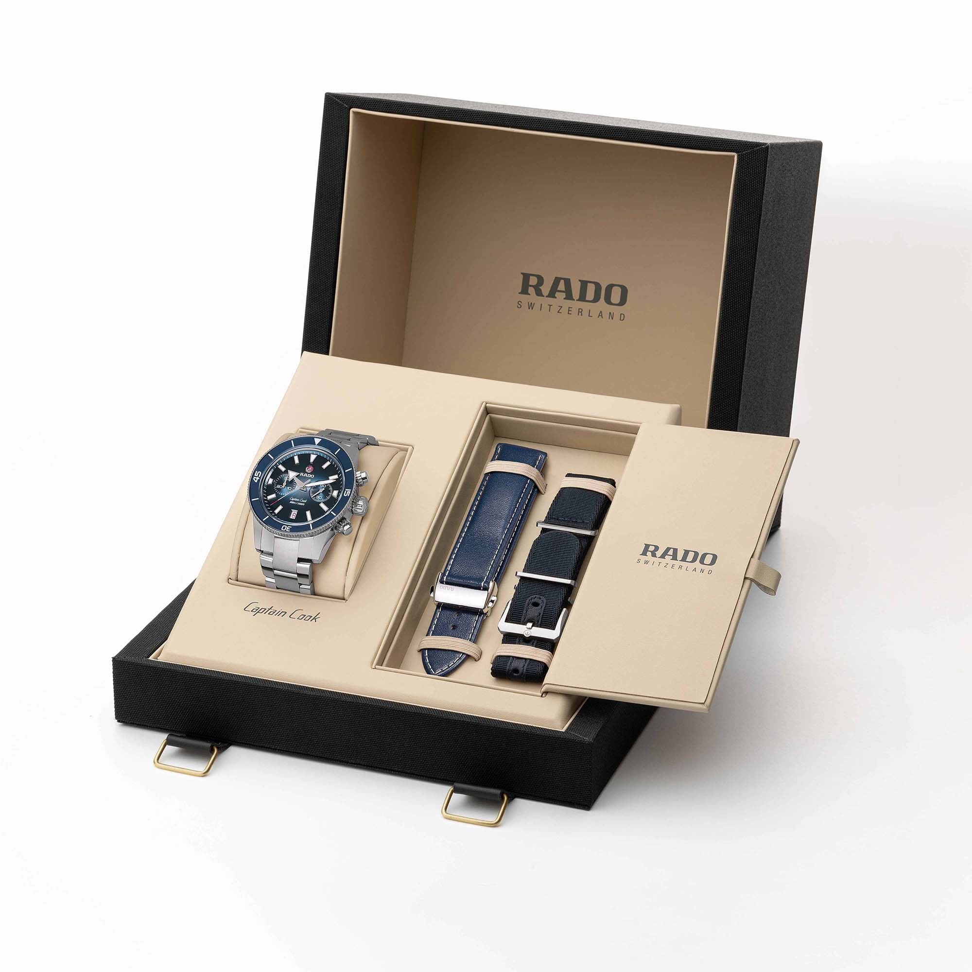 Dieser Chronograph aus der Captain Cook Serie zeichnet sich durch ein charakteristisches kratzfestes Saphirglas im Box-Shape-Stil mit beidseitiger Antireflexionsbeschichtung aus. Das 43 mm grosse Gehäuse aus Edelstahl verfügt über ein Lünetten-Inlay aus polierter blauer Hightech-Keramik – das perfekte Gegenstück zum Zifferblatt mit Farbabstufung von Silber zu Blau. Die Ziffern, Markierungen und Dreiecke der Uhr sind mit Super-LumiNova® behandelt. Im Inneren übertrifft das neue Automatikwerk mit einer Gangreserve von 59 Stunden dank einer nicht-magnetischen Nivachron™ Spiralfeder die Standardtestanforderungen und sorgt für eine höhere Genauigkeit. Geliefert wird das Modell mit einem Armband aus poliertem und gebürstetem Edelstahl sowie einem blauen Lederarmband und einem zusätzlichen Textilarmband in Ultramarinblau.