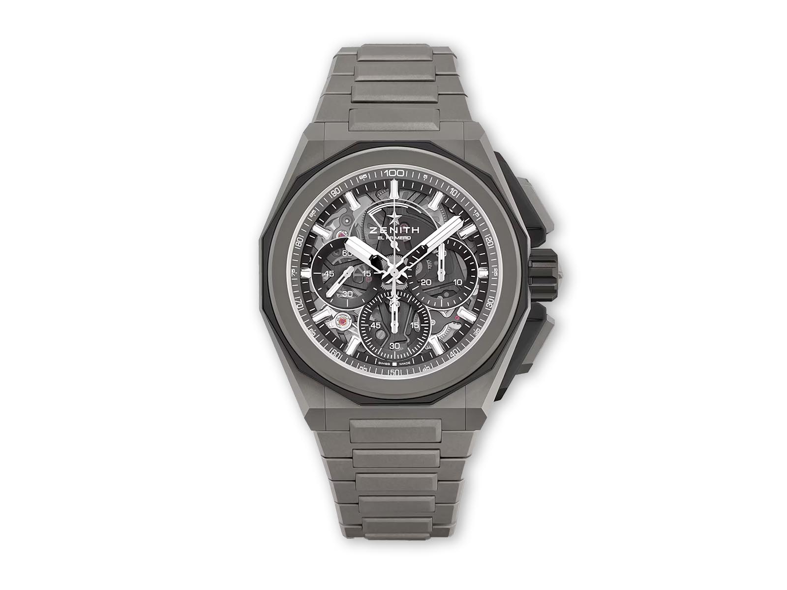 1/100-Sekunden-Chronograph aus leichtem, aber robustem Titan mit vollständig mattiertem Finish gefertigt. Das El Primero Chronographenwerk verfügt über zwei Regulierorganen und Hemmungen – eine für die Zeitmessung (5 Hz), eine für die 1/100-Sekunden-Chronographenanzeige (50 Hz).