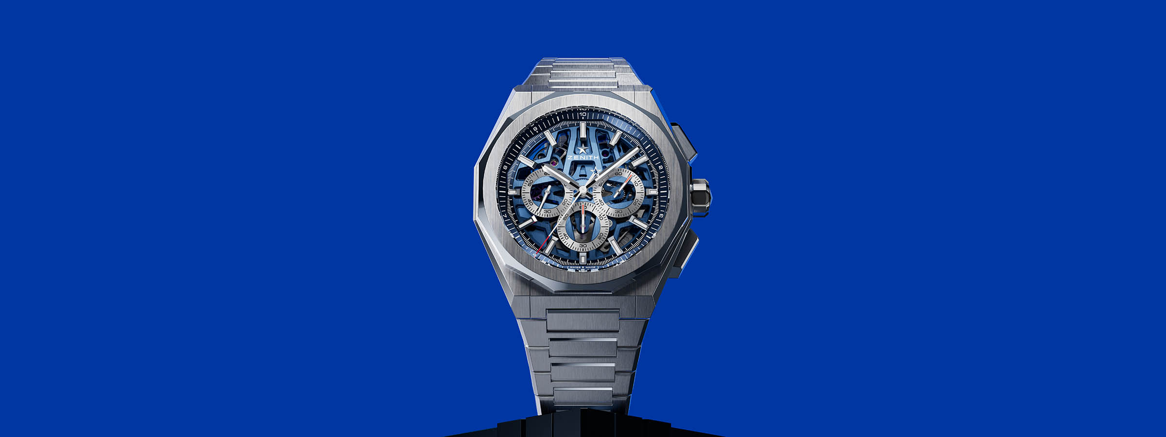 Eine Schweizer Uhrenmanufaktur, mit großer Tradition, die sich über weltweite Anerkennung hinsichtlich der Präzision ihrer Uhrwerke freuen darf. Zenith entwickelte das erste integrierte automatische Chronographenwerk, El Primero, welches noch heute als Referenz in seiner Klasse gilt. Als Schnellschwinger konzipiert, erlaubt das Werk die Messung von 1/10 Sekunden.