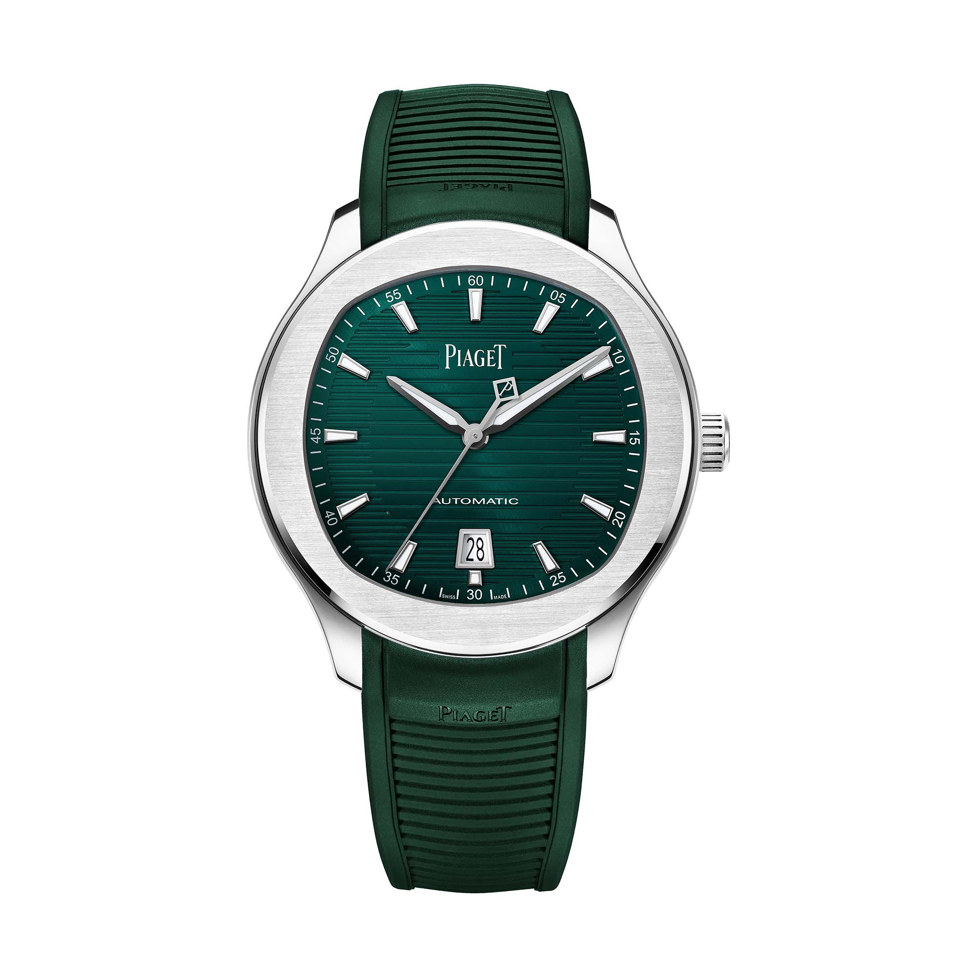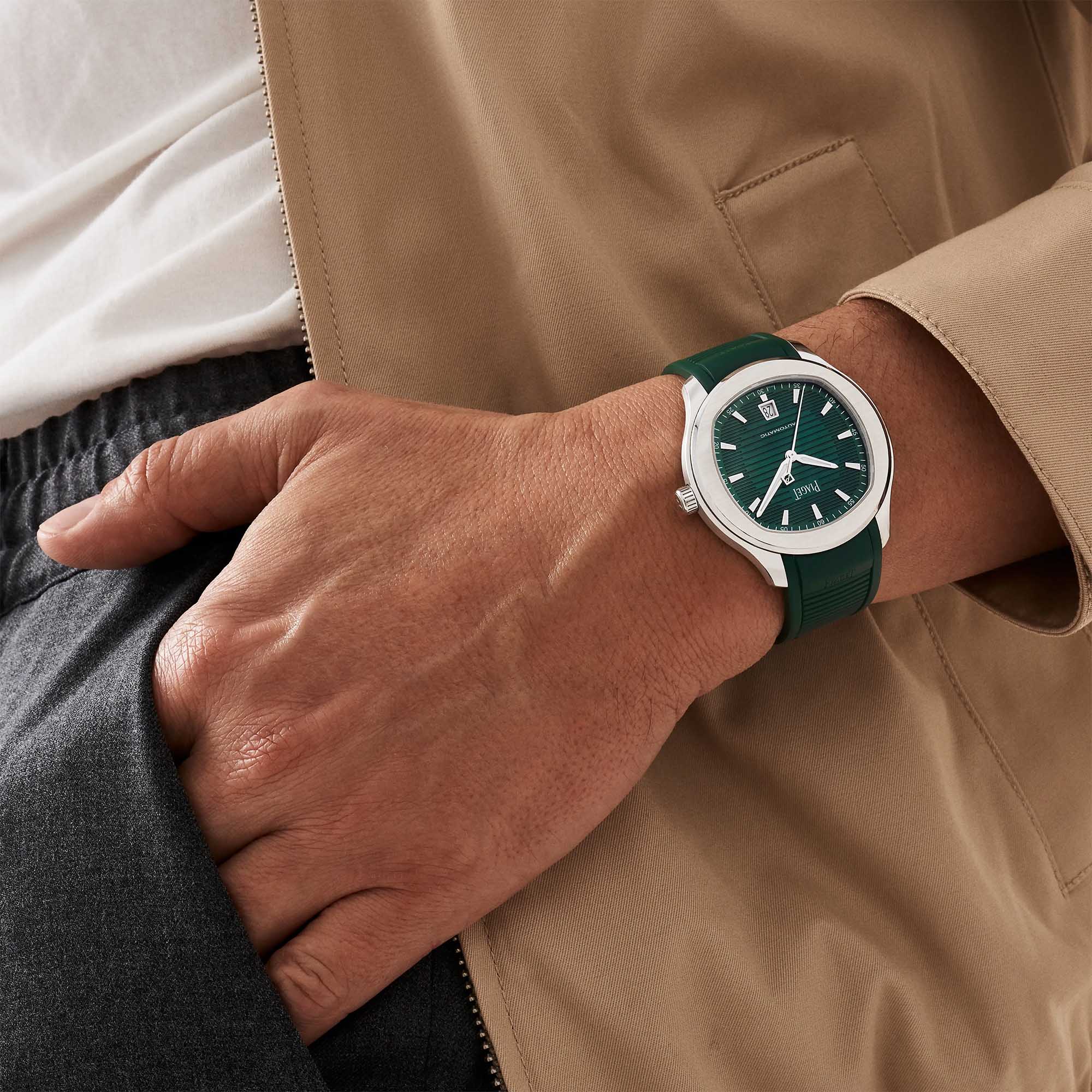 Piaget Polo Field Uhr, 42 mm. Gehäuse aus Edelstahl. Grünes Zifferblatt mit SuperLumiNova®-Indexen und -zeigern. Saphirglasboden. Auswechselbares Kautschuk-Armband. Mechanisches Manufaktur-Uhrwerk Piaget 1110P mit Automatikaufzug.
