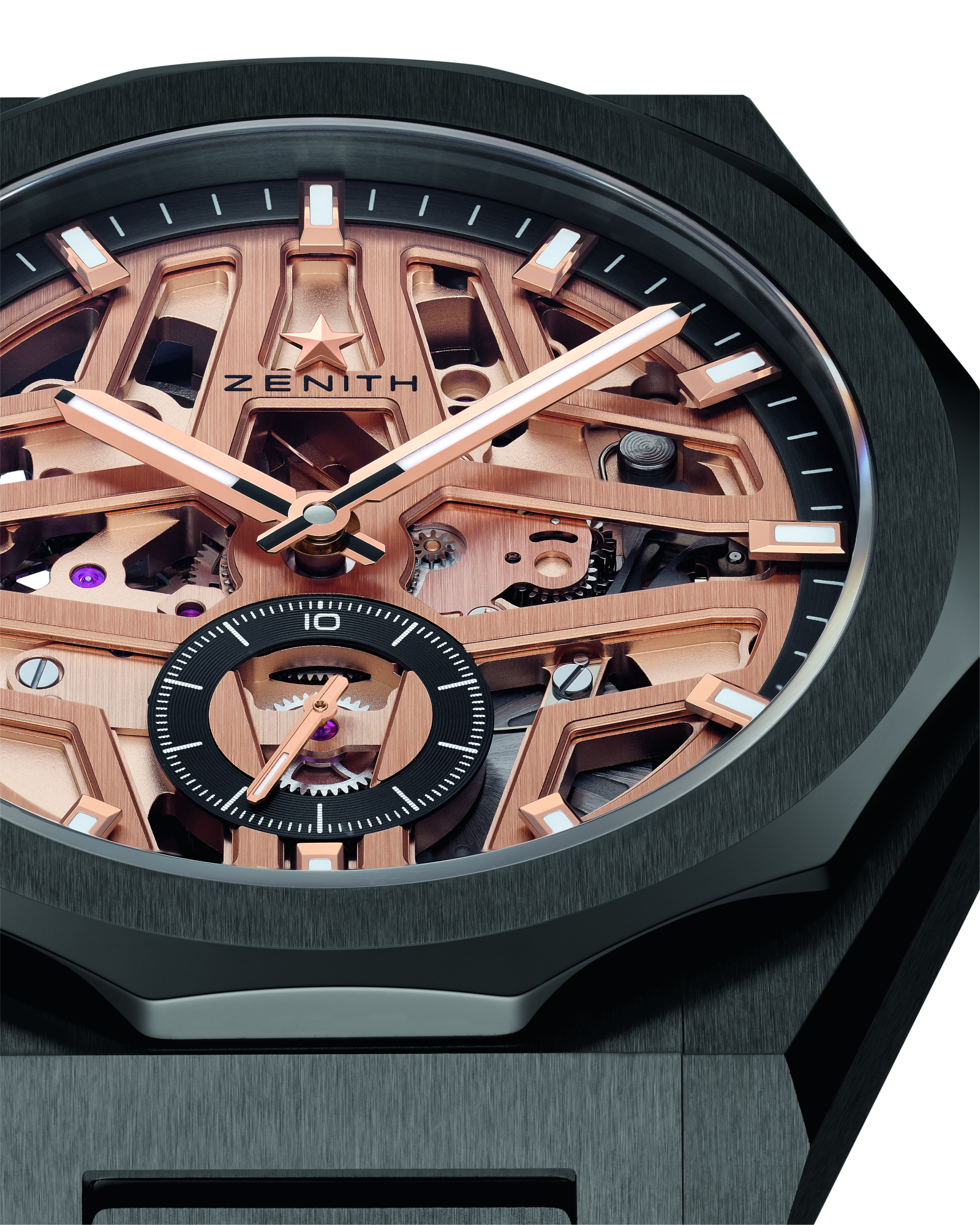 Dank ihrer markanten, durchbrochenen Architektur lässt die DEFY Skyline Skeleton kein technisches Detail des El Primero im Verborgenen – selbst die charakteristische 1/10-Sekunden-Anzeige kann in vollem Umfang bewundert werden. Die jüngste Ausgabe führt einen gänzlich neuen Kontrast ein und kombiniert tiefschwarze Keramik mit einem goldfarbenen Uhrwerk – eine Komposition, die an die blinkenden Lichter und huschenden Schatten einer modernen Stadtlandschaft erinnert.